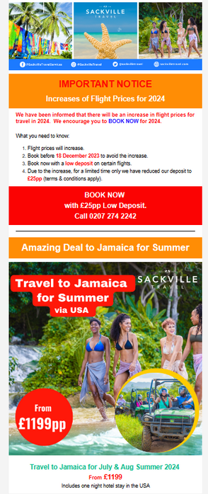 Sackville Travel Services Limited stands as a stalwart in the travel industry, with over four decades of experience in curating unforgettable journeys to the Caribbean, USA, and West Africa. Since its establishment in 1976, Sackville Travel has cultivated strong relationships with airlines, tourist boards, and hotel groups, earning a reputation for excellence and reliability in crafting bespoke travel experiences.